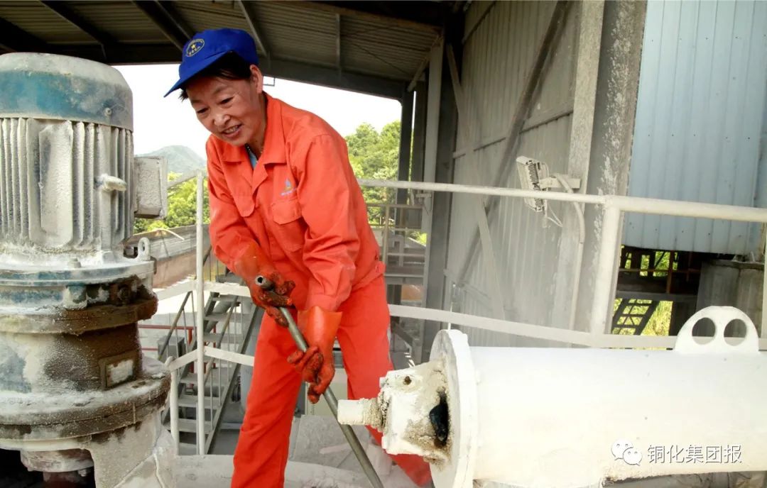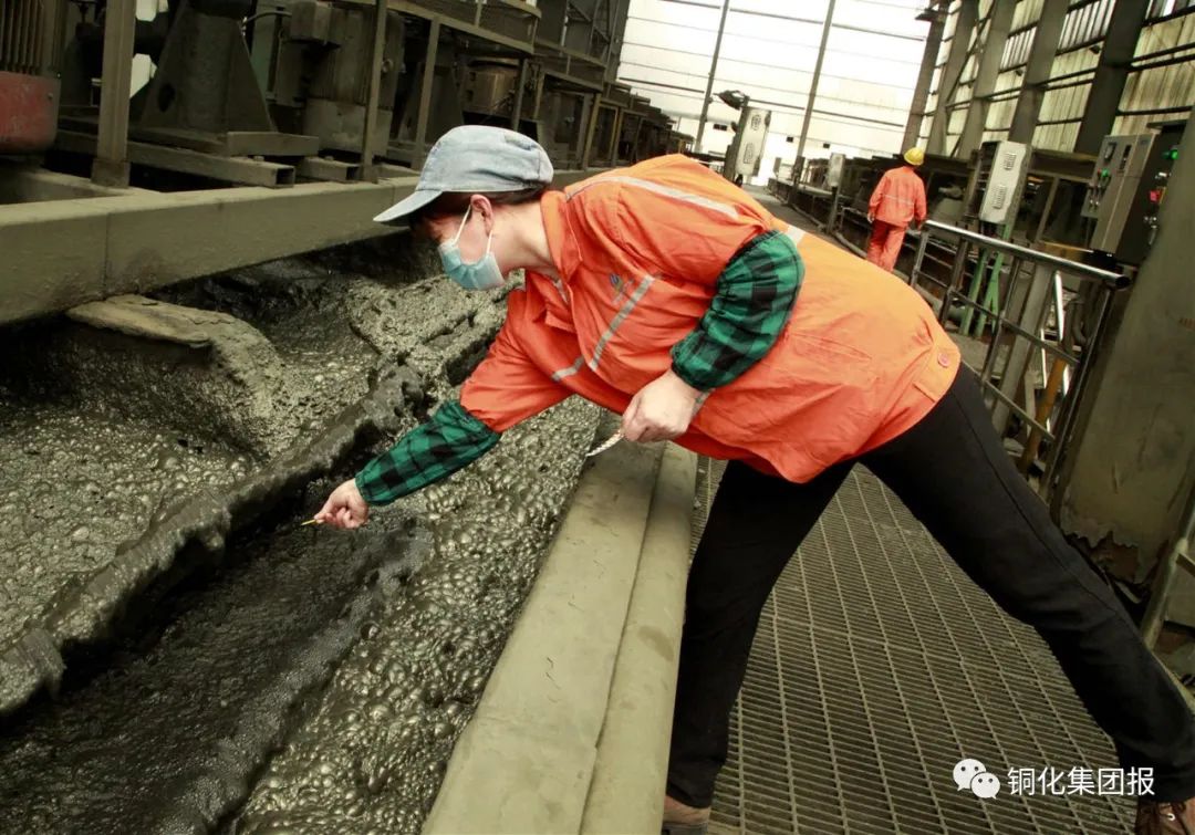 圖③:在選礦廠磨浮車間,選礦女工正在用pH試紙測試礦漿酸堿值。