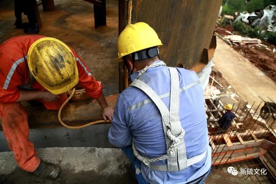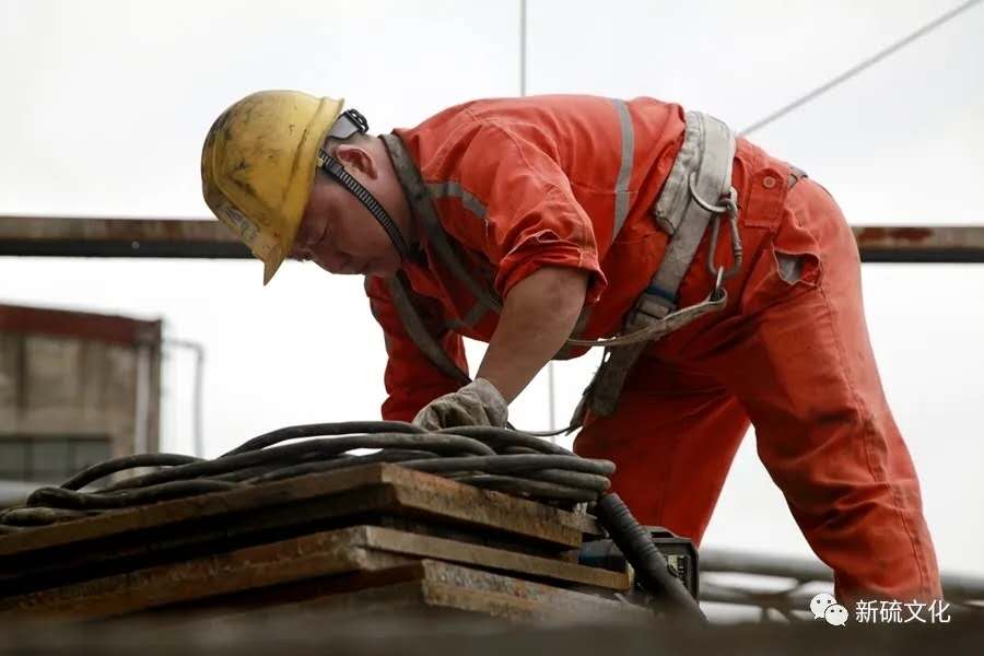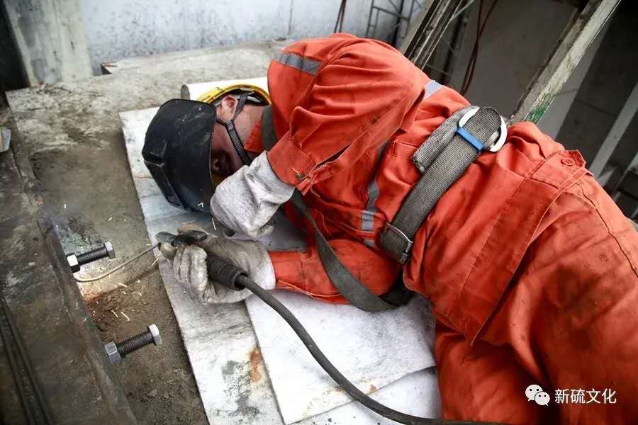 地面上大吊車、大貨車,選礦廠相關(guān)負(fù)責(zé)人、技術(shù)人員、安全員等忙著起吊龐然大物時(shí),“焊高組”在底座上也一刻沒閑著,拖運(yùn)電焊設(shè)備、準(zhǔn)備焊接材料、在底座上鋪水泥保持平面,各個(gè)槽體支腳找平衡......由于底座緊挨著磨浮車間,空氣不流通,加上天氣悶熱難擋,武裝整齊的好“焊”們一會(huì)就汗?jié)窳斯ぷ鞣怪轫樦踩眽褐陌l(fā)根往下滾。